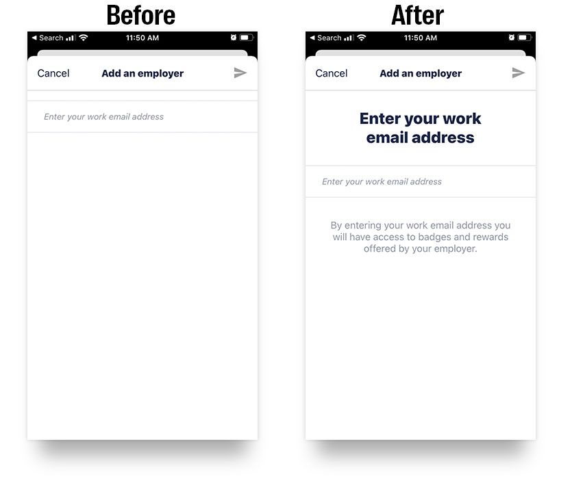 Despite this huge discovery, the results were mostly positive. Almost all Iphone users were able to successfully complete the task, without majors issues. Nevertheless, I noticed something that could be Improved. When the user is asked to connect with their employer, a few hesitations were noticeable. Even if the input's placeholder gave users the information they needed, It disappeared each time the field was active.