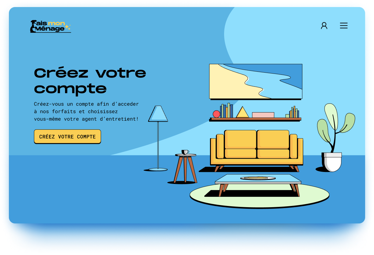 FaisMonMenage (DoMyCleaning) is an online tool featuring an API and an integrated CMS. I was in charge of building the brand, mockup, front-end and web animations.